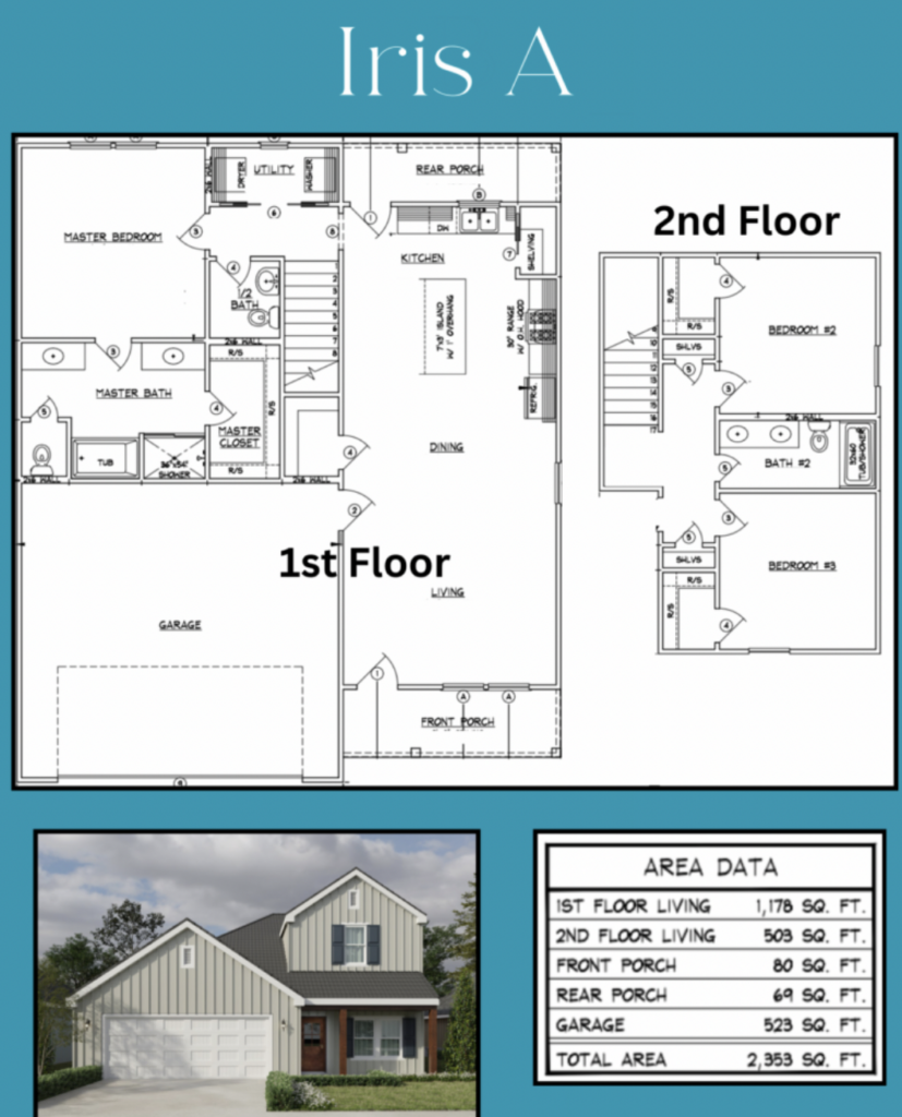 The Iris is a two-story, 3 bedroom 2.5 bathroom plan with a 2-car garage, inviting front and rear porches, and an open concept living area. The kitchen features a large island and is open to the living room and dining room. The main suite has windows overlooking the backyard, an ensuite bath with double vanities, a shower and separate soaking tub, and and a walk-in closet. Bedrooms 2 and 3 are on the second floor and share a bath with double vanities. The half bath and utility room are conveniently located at the base of the stairs and near the main bedroom.